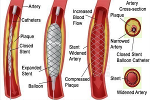 Coronary stents are now used in nearly all angioplasty procedures. A stent is a tiny, expandable metal mesh coil. It is put into the newly opened area of the artery to help keep the artery from narrowing or closing again. Once the stent has been placed, tissue will start to coat the stent like a layer of skin.